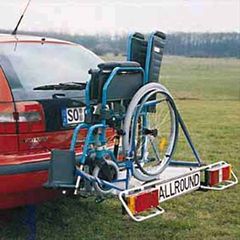 Heckträger mit Plattform von Allround für ein klappbaren Rollstuhl als Lastenträger. Der Lastenträger von Allround als Plattformträger und Heckträger.