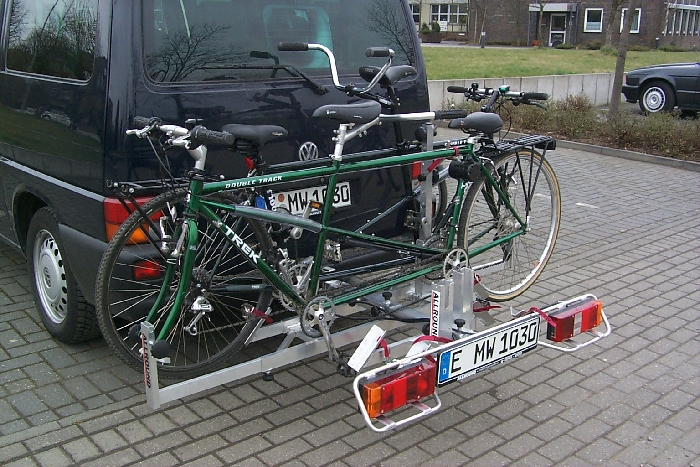 Heckträger von Allround für 1 Tandem und 2 Fahrräder als Fahrradträger. Der Fahrradträger als Tandemträger und Heckträger.